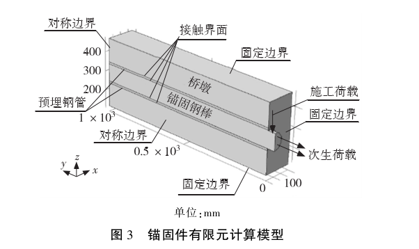 采用三維有限元建立橋梁模板橋墩和鋼梢棒等錨固件的實體幾何模型,鑒于橋梁模板橋墩自身設計荷載遠高于蓋梁澆筑期間的施工荷載,可認為橋梁模板橋墩整體發生破壞的可能性很小,僅可能出現錨固件周圍的局部破壞,因此為簡化計算,僅基于對稱原則建立錨固件周圍長度、寬度和高度分別為1 000 mm ,150 mm和300 mm范圍內的幾何模型,采用對稱界面實現模型的對半映像,忽略同一不落地支架相鄰兩錨固件的相互影響?紤]到橋梁模板橋墩內密集配筋產生的強約束條件,模型的底面、頂面和外側面均采用固定邊界條件,內側面和背側面采用對稱邊界,外側面采用自由邊界。鋼梢棒與預埋鋼管之間采用法向硬接觸和切向光滑的接觸界面模擬,抗壓不抗拉;預埋鋼管與橋梁模板橋墩混凝土之間采用粘附接觸界面。鋼梢棒外露端頂部施加垂向的施工荷載,模擬牛腿腹板與鋼梢棒的接觸應力;外露截面施加縱向的次生施工荷載鋼梢棒拉力,計算見2. 3節。幾何模型如圖3所示。www.p2y8erm.cn